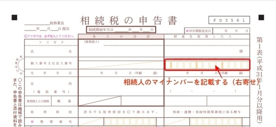 相続税申告の際のマイナンバーは、相続税の申告書(第1表の上部)に相続人のマイナンバーを記載します。